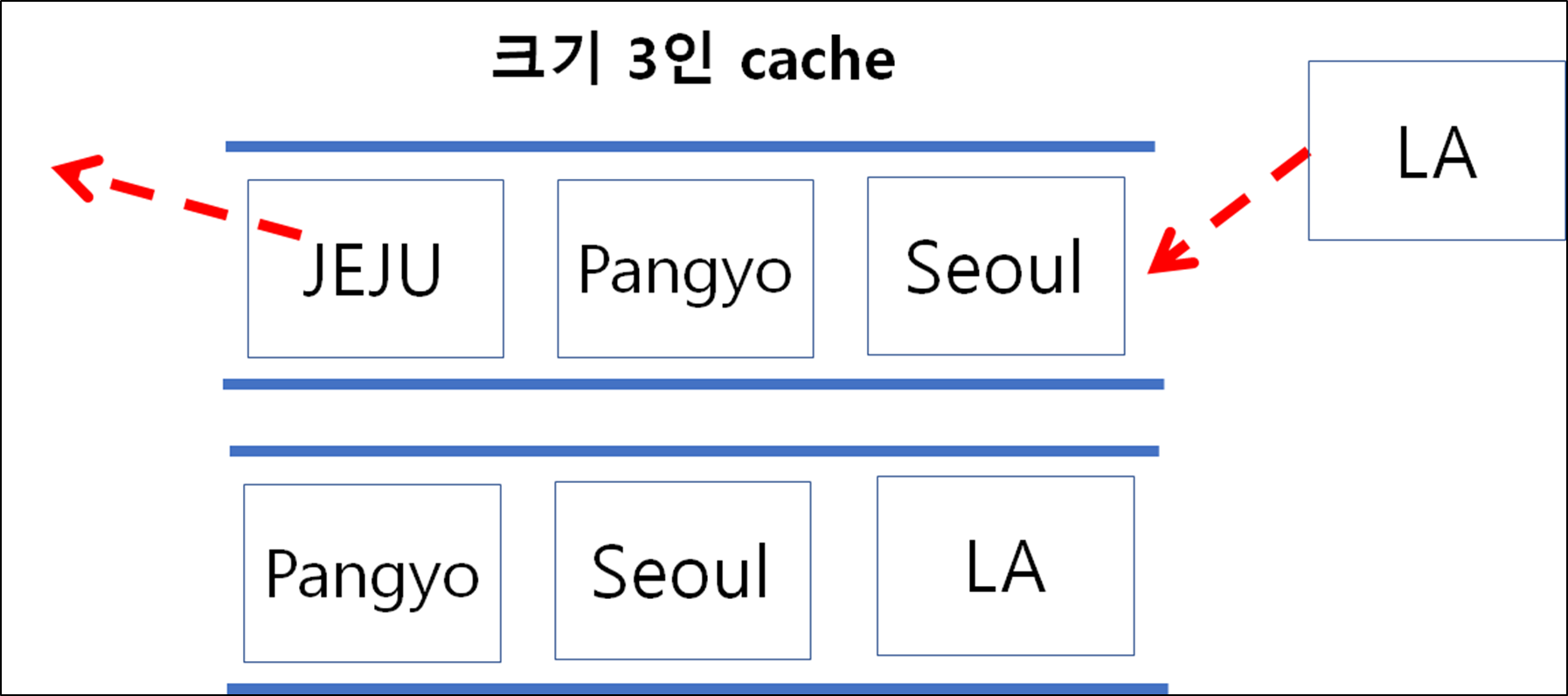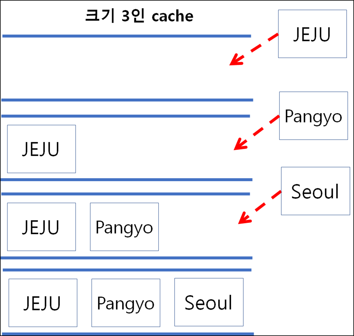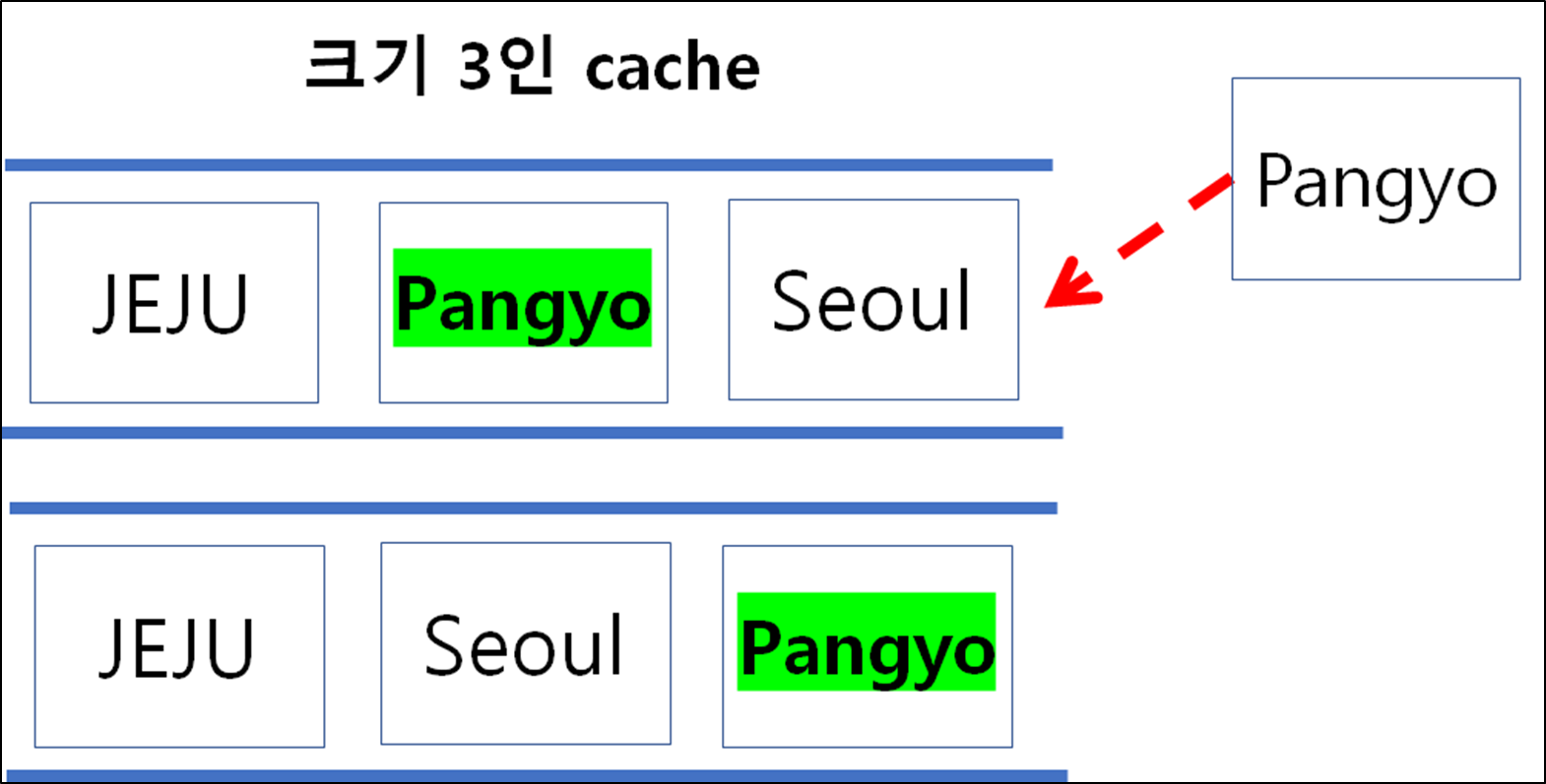 - 크기가 3인 cache에 (JEJU, Pangyo, Seoul) 순차 삽입